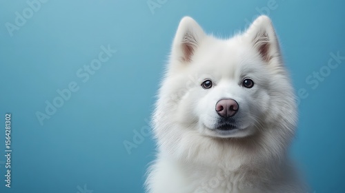 A fluffy white Samoyed dog with a pink nose poses against a serene blue backdrop, its eyes soft and gentle.