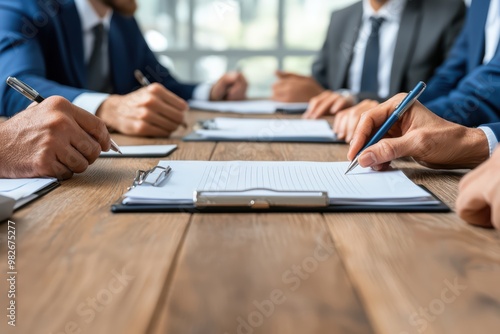A focused business meeting scene with professionals discussing documents and taking notes on a wooden table.