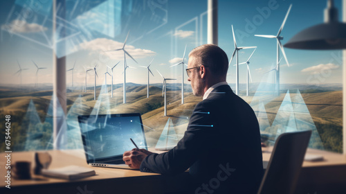 A focused businessman analyzes renewable energy designs on his laptop with holographic blueprints, in an office overlooking wind turbines.