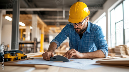 A focused construction worker in a hard hat and glasses measures on a blueprint at a workshop, emphasizing precision and planning.