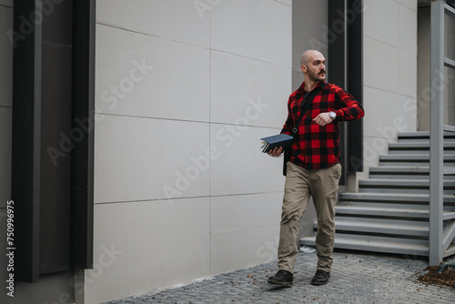 A focused entrepreneur outdoors checks his watch as he carries a notebook, seemingly late for a business meeting.