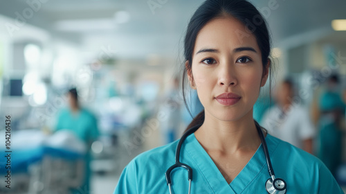 A focused healthcare professional in scrubs and stethoscope stands in a busy hospital environment, symbolizing dedication and care in the medical field.