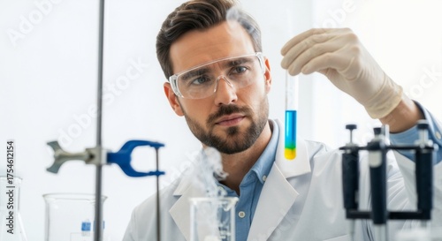 A focused male scientist in a lab coat conducting a chemistry experiment. Researcher in a modern laboratory analyzing a colorful liquid in a test tube. Scientific discovery and biotechnology concept
