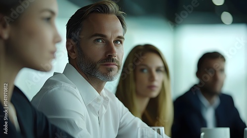 A focused, middle-aged Caucasian man at a professional meeting with diverse colleagues.