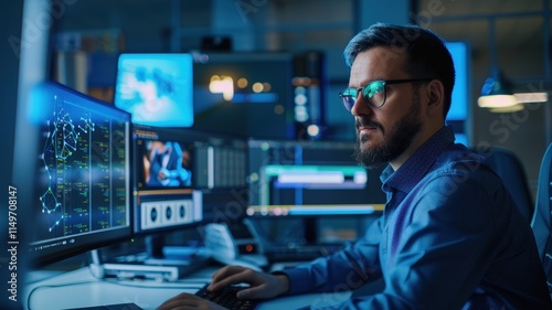 A focused professional analyzes data on multiple screens in a dimly lit workspace, showcasing modern technology and a high-tech environment.