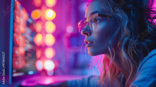 A focused woman with glasses gazes intently at computer screen, illuminated by vibrant pink and blue lights, creating colorful contrast and intricate splash pattern in background