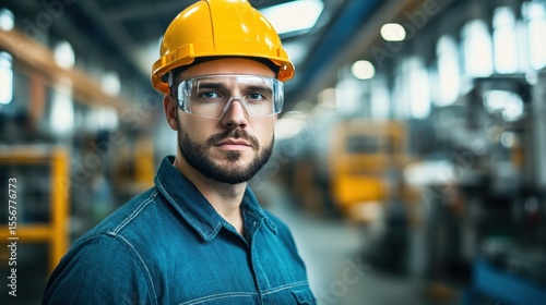 portrait, year, old, european, male, engineer, stand, safety, helmet, goggles, workshop, industrial, men at work, equipment, machinery, sharpened, serious, labor, profession, young, confidence, technology, career, environment, tool, activity, blue, shirt, construction, personal, hard hat, attire, coiffure, background, interior, light, innovation, performance, training, industry, task