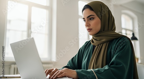woman, laptop, working, focused, professional, home, desk, computer, technology, business, entrepreneur, student, learning, online, digital, modern, stylish, elegant, confident, serious, concentrated, productive, efficient, successful, career, ambition, goal, future, independent, empowered, female, muslim, faith, culture, lifestyle, work, remote, indoor, light, bright, space