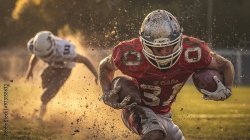 football, player, tackle, dirt, game, action, sport, athletic, competition, team, field, running, motion, energy, excitement, strength, strategy, training, performance, victory, challenge, speed, agility, intensity, gear, helmet, uniform, muddy, determination, skill, rival, score, play, rush, sharpened, adrenalin, crowd, teamwork, effort, passion, ball, defense, offence, youth, athleticism, endurance