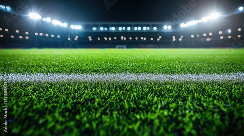 A football stadium under floodlights, showcasing the vibrant green grass of the field.