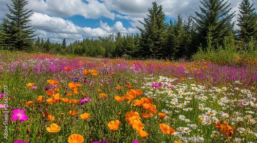 A forest background image showcasing a vibrant field of wildflowers in full bloom, with pine trees and fluffy white clouds overhead