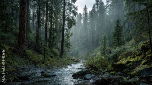 A forest with a stream running through it. The water is clear and the trees are tall