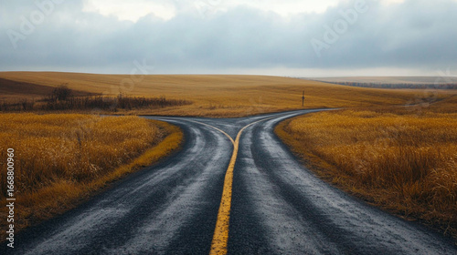road, fork, path, choice, decision, direction, journey, future, way, travel, landscape, field, gold, autumn, sky, cloud, wheat, grass, rural, countryside, asphalt, yellow, line, in, the, cleaving, option, destination, uncertainty, adventure, exploration, nature, scenery, open, country