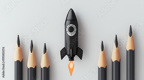 A formation of graphite pencils shaping a sleek rocket, surrounded by a dashed line rocket outline on a plain light gray background. Dewshade. Illustration