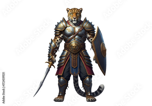 warrior, armoring, shield, sword, leopard, animal, fantasy, illustration, digital, design, character, strong, powerful, hero, mediaeval, gold, black, silver, red, spotted, paw, protective, combat, detailed, art, beautiful, colourful, bright, creative, modern, elegant, stylish, professional, decorative, vibrant, stunning, amazing, marvellously, fantastic, gorgeous, lovely, charming, attractive, impressive, spectacular, magnificent