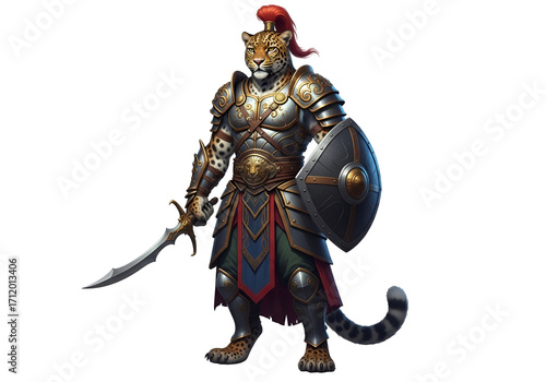 warrior, armoring, shield, sword, panther, animal, fantasy, character, illustration, digital, art, design, mediaeval, strong, powerful, gold, silver, black, red, green, detailed, realistic, elegant, hero, creature, protection, weapon, standing, figure, beautiful, colourful, bright, creative, modern, stylish, professional, decorative, vibrant, stunning, amazing, marvellously, fantastic, gorgeous, lovely, charming, attractive, impressive