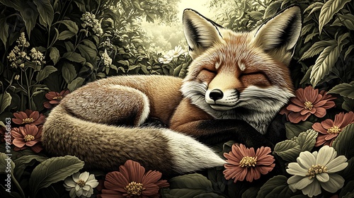 A fox curled up peacefully in a bed of vibrant flowers and lush green leaves, surrounded by delicate petals. The soft morning light filters through the trees, creating a serene,