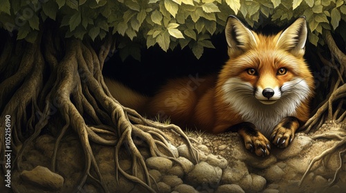 A fox dwelling in a burrow nestled within the roots of a tree, showcasing its natural habitat in a serene environment