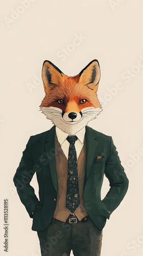 A fox in a dark green office blazer and tie, standing with hands in pockets in front of a neutral beige background with ample empty space.