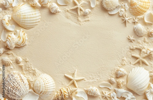 A frame of beige sand with seashells and starfish, top view. Summer background for your design.