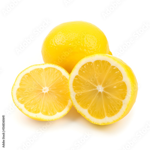 A fresh lemon, whole and halved, isolated on a transparent background, juicy yellow flesh, glossy peel, water droplets, hyper-realistic, bright studio lighting.