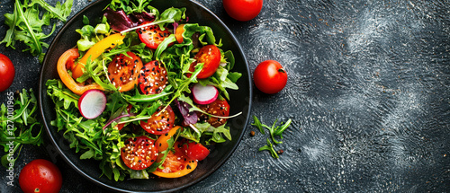 salad, vegetable, tomatoes, pepper, greener, healthy, colourful, radish, alimentary, meal, herb, sesame, dressing, epicure, vegetarian, bright, ingredient, leafy, crunchy, plate, side, dish, appetising, seasonal, wholesome, produce