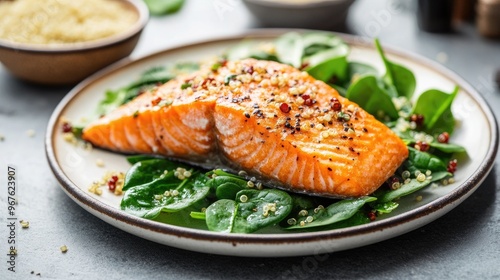 A fresh salmon fillet on a plate, paired with spinach and quinoa, representing a brain-nourishing meal.