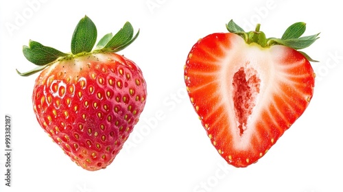 strawberry, fruit, red, green, ripe, juicy, slice, fresh, organic, whole, isolated, white, background, healthy, food, summer, sweet, delicious, dessert, vitamin, nature, berry, agriculture, garden, seed, leaf, cut, closeup, macro, detail, texture, natural, bright, colours, high-coloured, tasty, sweetness, seasonal