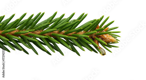 A freshly cut emerald green evergreen fir sprig on a transparent background, dew-kissed needles, fibrous bark, pale wood, and a golden resin bead slowly forming, concept of microscopic nature beauty