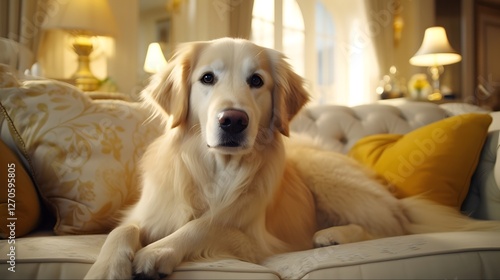 A friendly and fluffy golden retriever dog sitting comfortably on a cozy couch in a warm and inviting living room interior with soft lighting