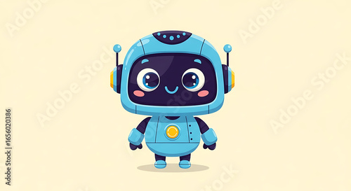 robot, blue, cartoon, character, cute, happy, smiling, technology, artificial, intelligence, design, illustration, digital, graphic, isolated, background, cheerful, friendly, adorable, antennae, eye, face, head, body, metal, machine, future, automation, circuit, coding, computing, communication, device, engineering, contraption, innovation, cyberspace, cognition, learning, logic, network, programming, science, software, system