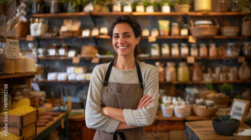 A friendly shopkeeper standing confidently with crossed arms in a cozy organic store filled with natural products and warm lighting.