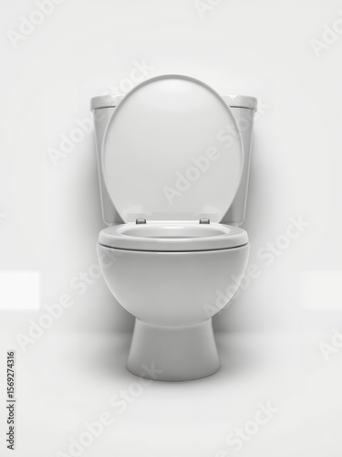 A front view of a clean white toilet with the seat up against a white background in a bathroom