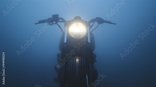 motorbike, headlamp, fog, halo, motorcycle, bike, headlamp, soft light, illuminated, vehicle, adventure, travel, riding, transportation, front view, glowing, hazy, misty, road, weather