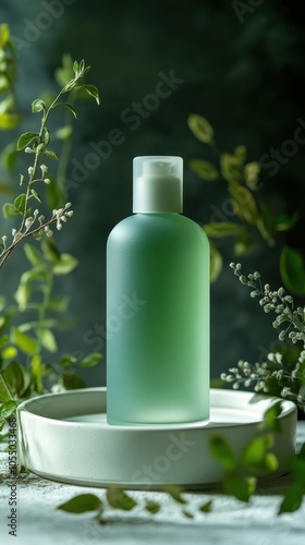 A frosted green skincare bottle rests on a ceramic tray, surrounded by lush organic plants