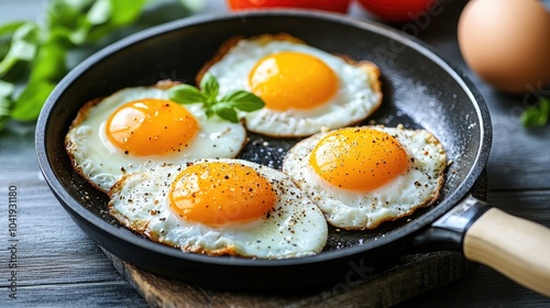 A frying pan holds perfectly cooked sunny-side-up eggs with golden yolks,
