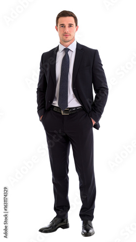 A full shot of a man standing with his hands in his pockets wearing a suit and tie on a transparent background