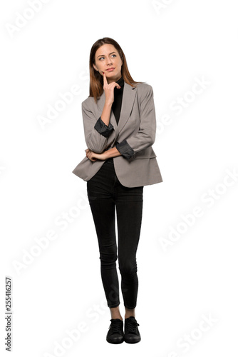 A full-length shot of a Business woman thinking an idea while looking up over isolated white background