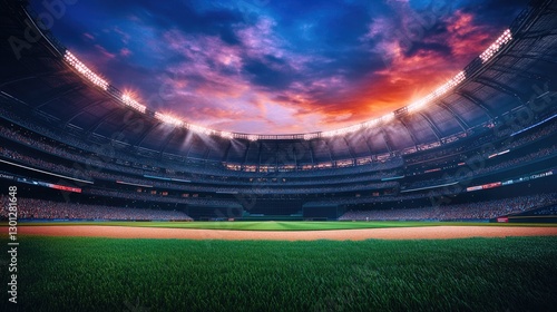 A fully lit baseball stadium at night with a detailed view of the infield.