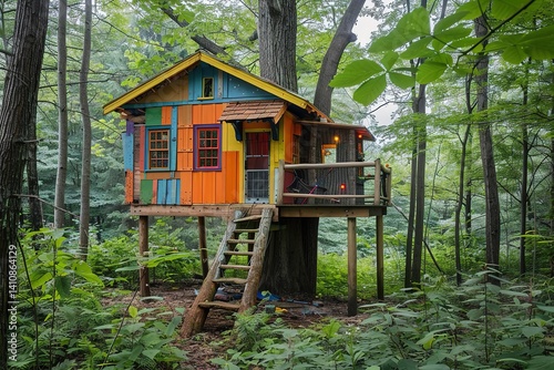 treehouse, colourful, nature, forest, playhouse, childhood, whimsical, adventure, rustic, elevated, stair, greenery, summer, fun, retreat, cosy, family, relaxation, exploration, environmentally friendly, artistic, imaginative, tranquil, peaceful, bright, playful, creative, scenic, environment, leisure, camping, get-away, fantasy, hand-made, craftsmanship, wood, tree, foliage, landscape, serenity, escape, hideaway, charming