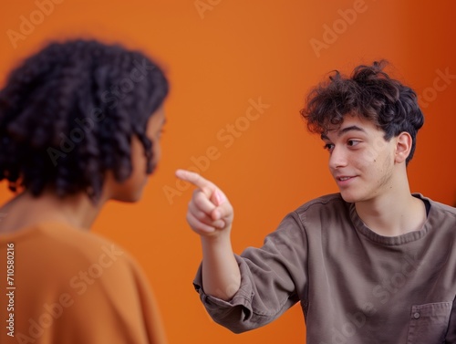 A funny cool, smiling young man in casual outfit showing something to a girl, pointing at a person or helping her to find her way using deaf sign language, or playing a game where he is miming