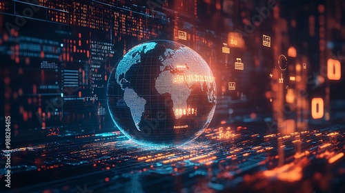 futuristic, three-dimensional, globe, rotating, arrow, floating, icon, various, good, set, against, digital, background, binary, code, datum
