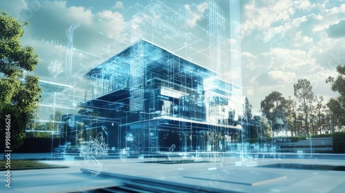 A futuristic architectural studio where AI designs innovative buildings, featuring 3D models and dynamic structures visualized on holographic displays.