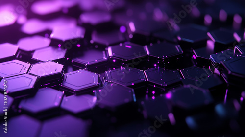 A futuristic background with dark purple hexagonal shapes, like a honeycomb. It represents blockchain technology with connected blocks, creating a low-poly, digital design.