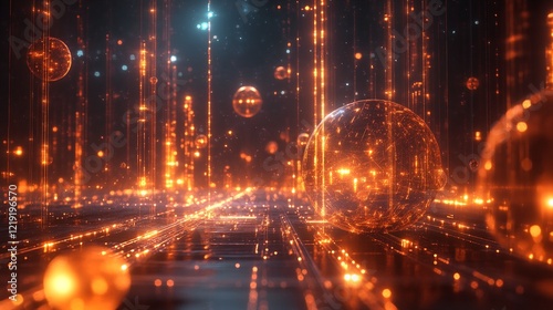 a futuristic cityscape at night with a prominent, glowing orange sphere in the foreground.