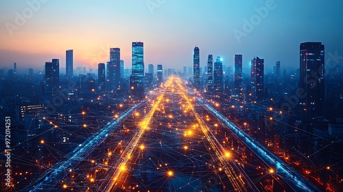 A futuristic cityscape at twilight, with glowing neon communication lines connecting advanced highways, smart trains, and sleek glass skyscrapers.