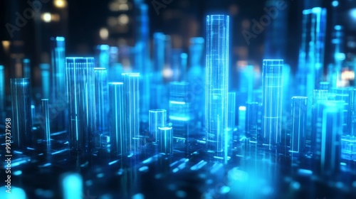 A futuristic cityscape made of glowing 3D bar chart bars, symbolizing data and analytics transforming into urban development and technological advancement
