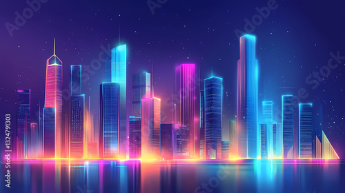 A futuristic cityscape with glowing, holographic buildings, lit up in vibrant neon colors against the night. Ambient Fluorescence. Illustration
