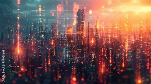 A futuristic cityscape with glowing lights and a vibrant color palette. The city is filled with tall buildings and a sense of energy and progress.