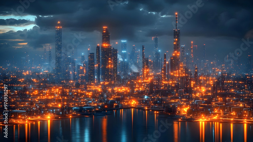 A futuristic cityscape with glowing lights reflecting in a body of water. The scene is dominated by towering skyscrapers and a dark, cloudy sky.